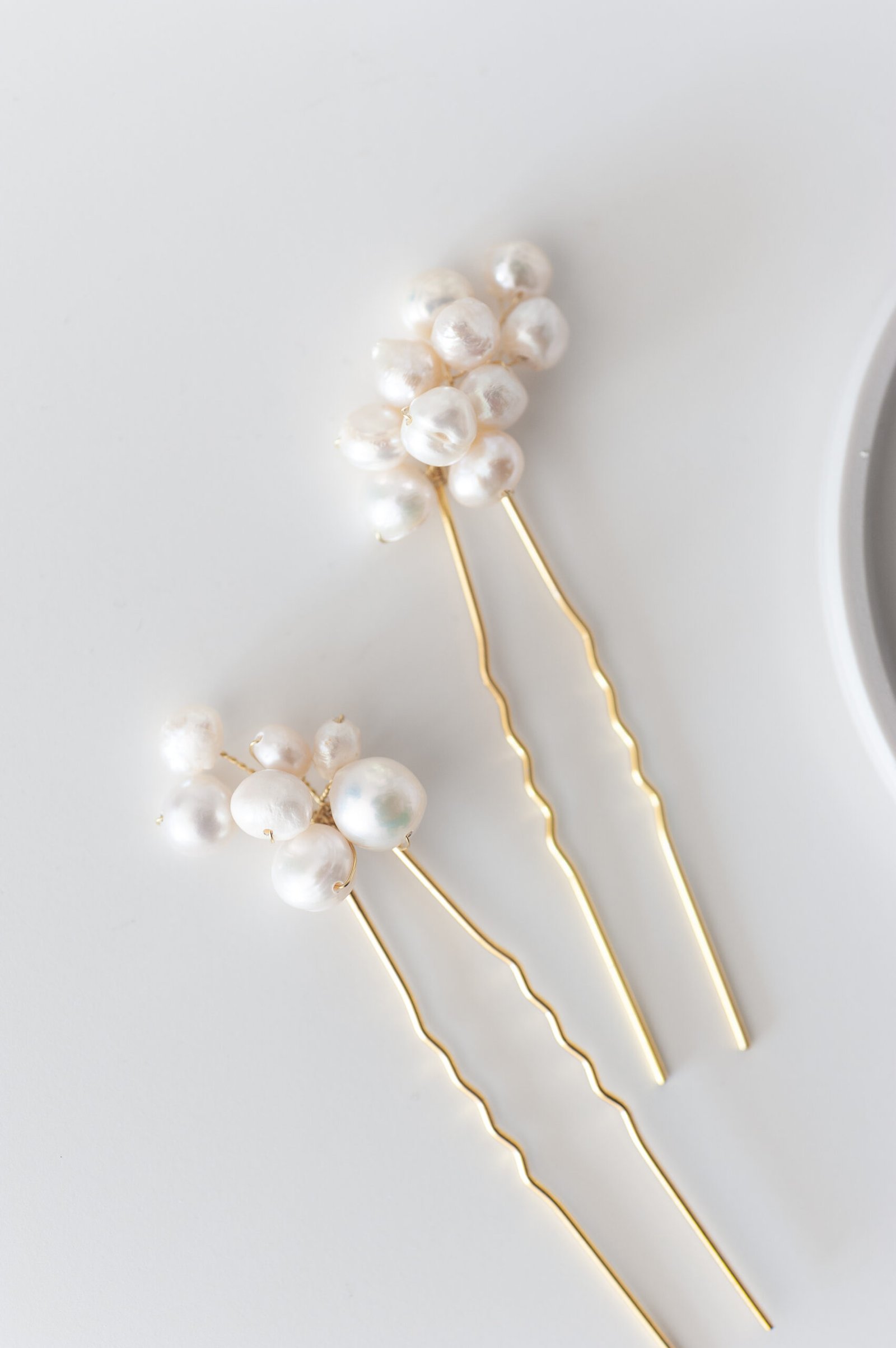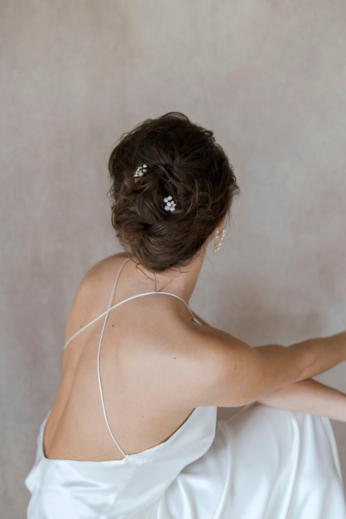 Die Haarnadeln LIVIA verkörpern zeitlose Eleganz und stilvolle Zurückhaltung. Kleine Cluster aus zarten Kunstperlen zieren die Spitze jeder goldenen Haarnadel und setzen dezente, aber wirkungsvolle Akzente in deiner Brautfrisur. Besonders in Kombination mit den gleichnamigen LIVIA Ohrringen entsteht ein harmonisches Brautschmuck-Set voller Anmut.