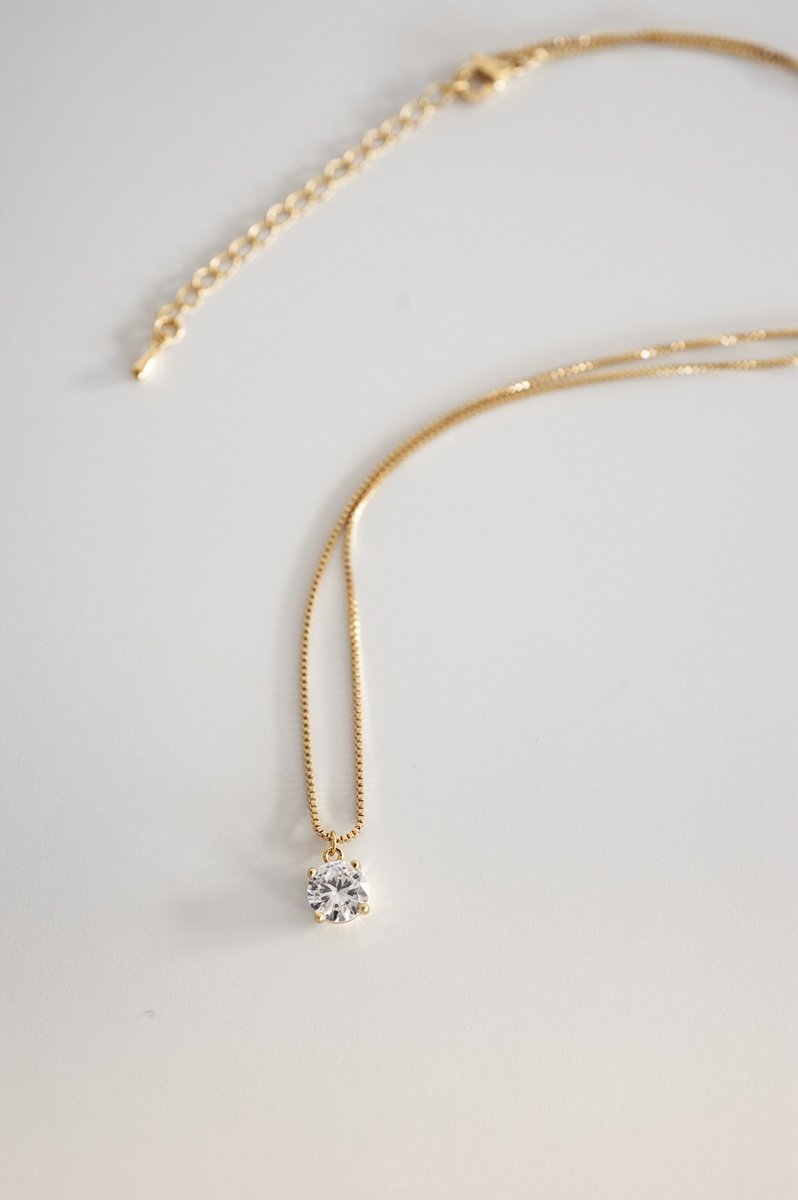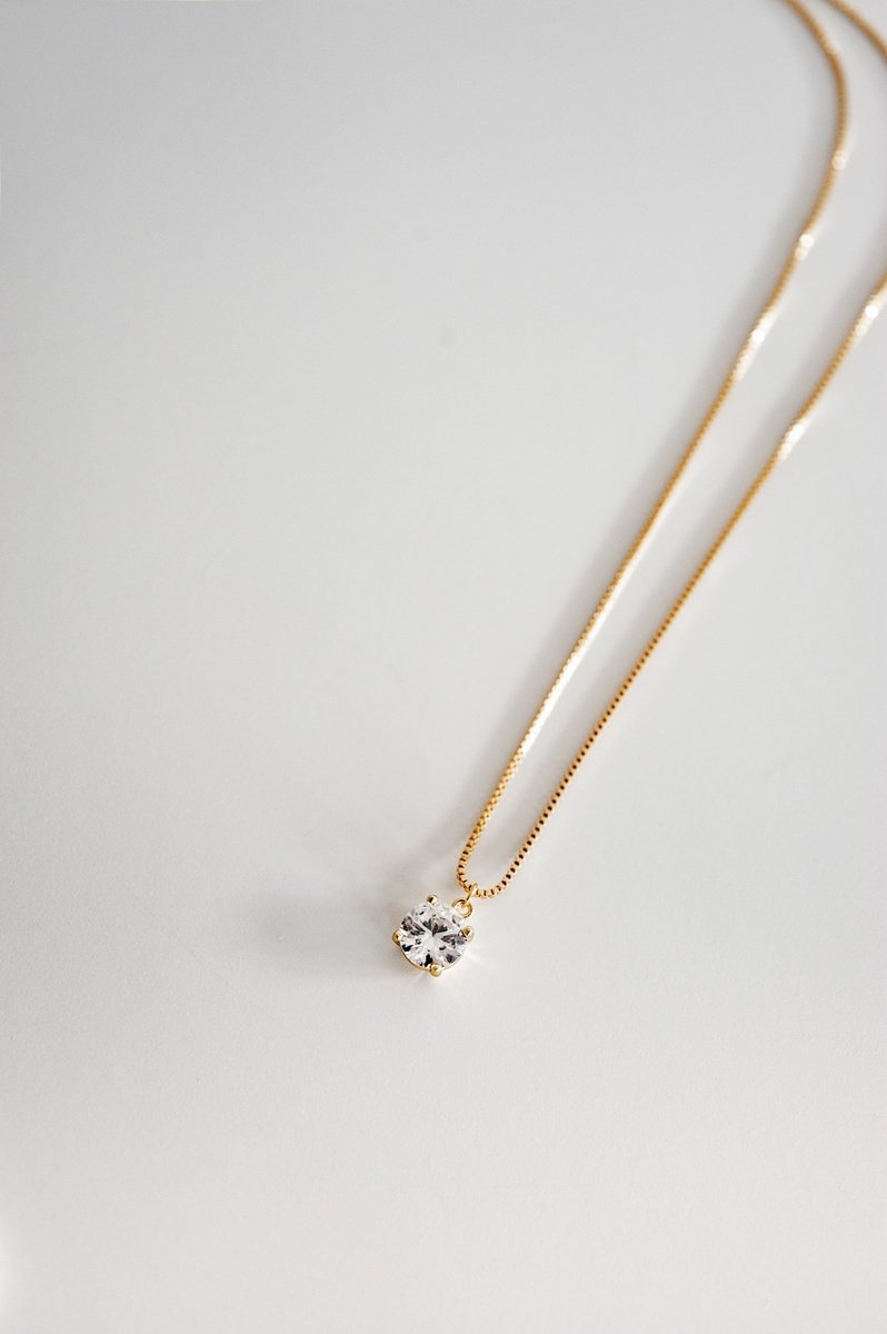 Ein solitärer Zirkonia-Stein in klassischer Krappenfassung hängt an feiner vergoldeter Kette und fängt das Licht wunderschön ein. Dieses dezente Schmuckstück verleiht jedem Look eine raffinierte Note und passt damit perfekt zum Brautkleid und als täglicher Begleiter.