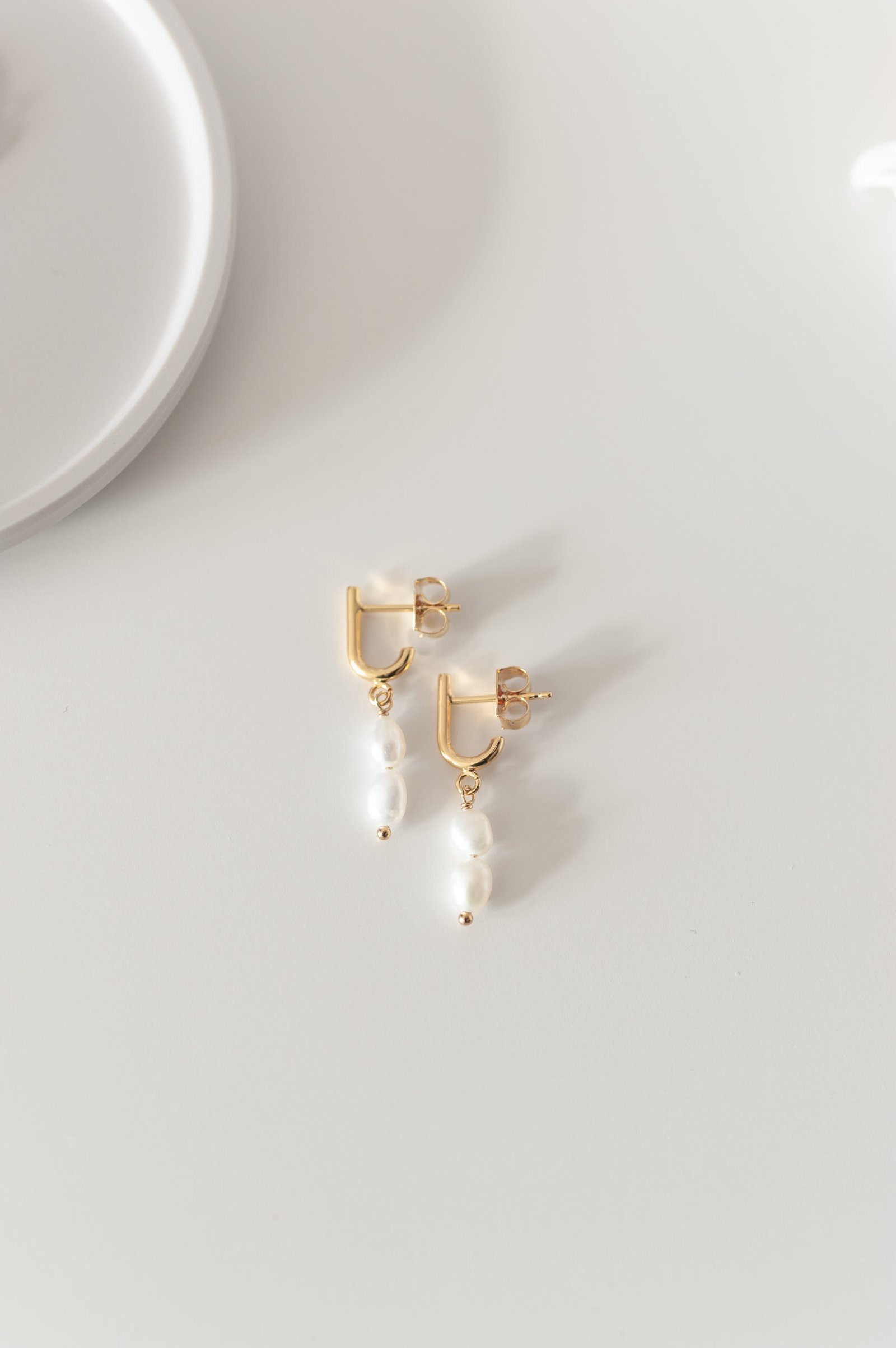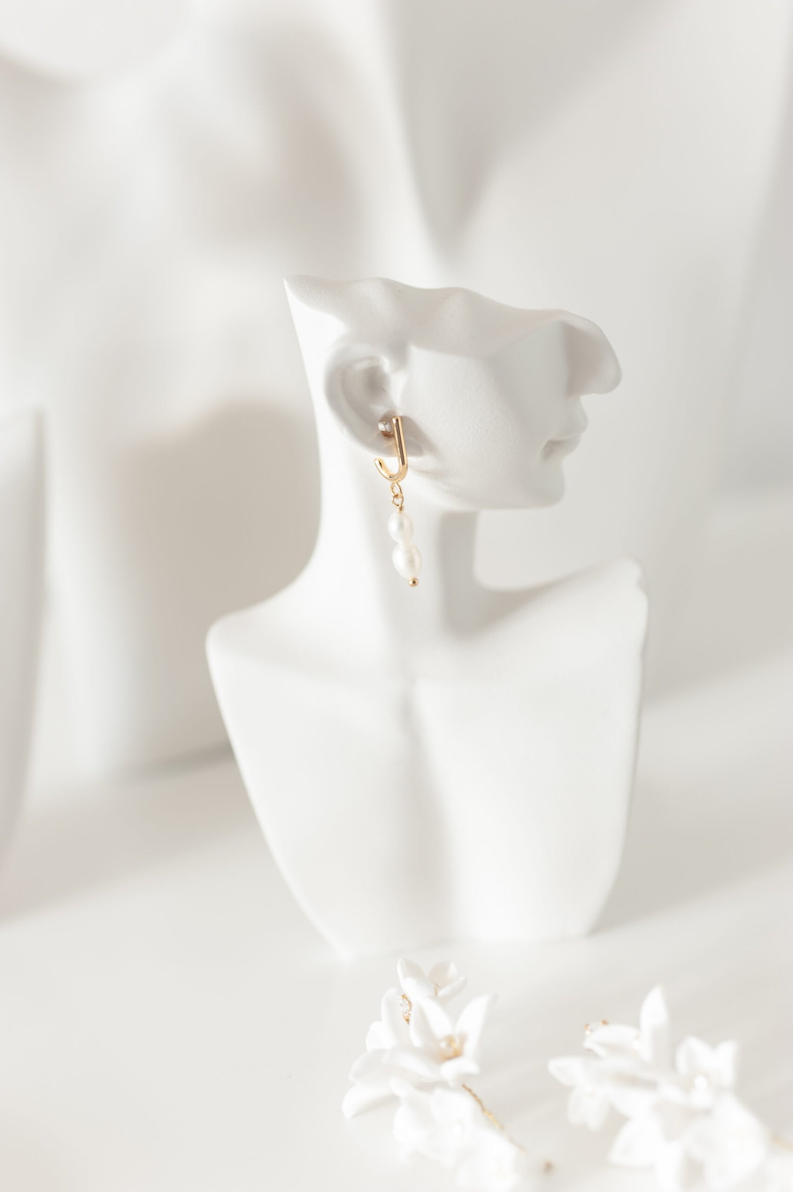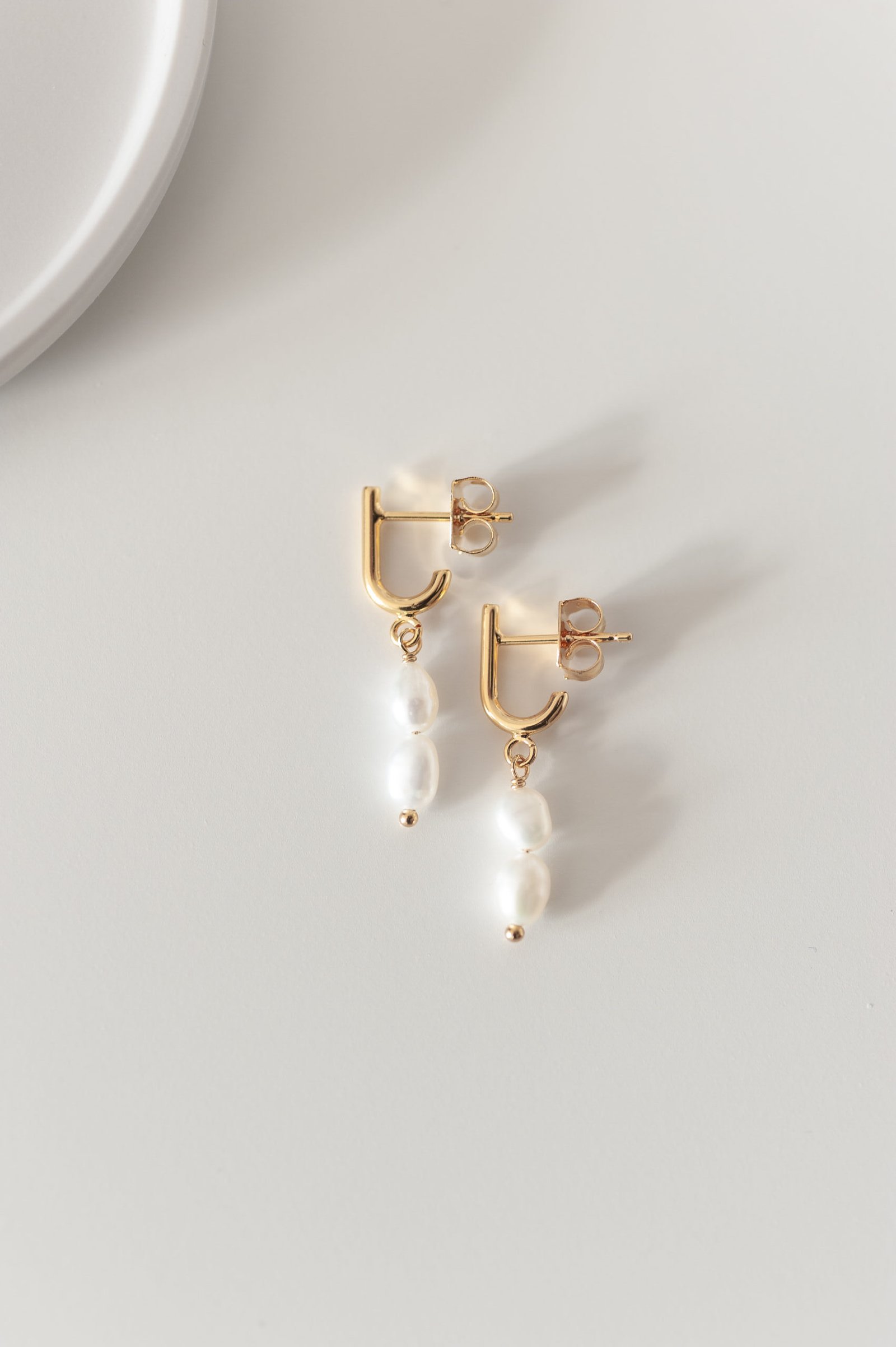Die Ohrringe ELLA treffen den perfekten Mittelweg zwischen dezent und extravagant. Besonders geformte Ohrstecker aus vergoldetem Messing treffen auf zwei zarte echte Süßwasserperlen, die vom J-förmigen Stecker herabhängen. Diese raffinierte Komposition verleiht deinem Brautlook eine moderne Eleganz mit klassischem Touch.
