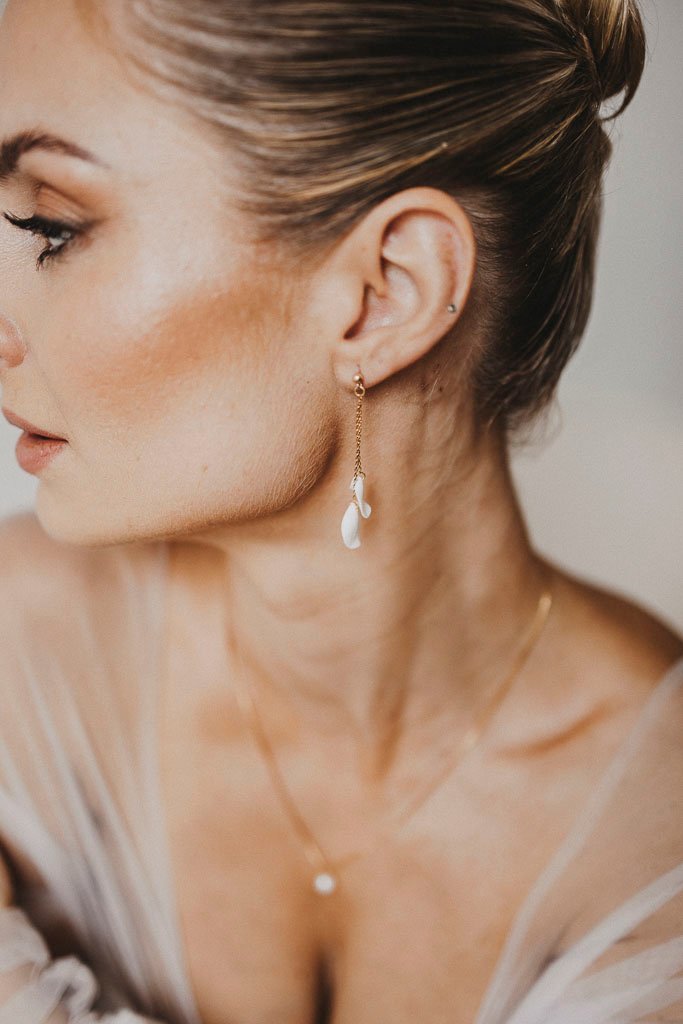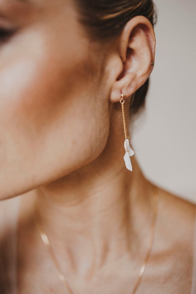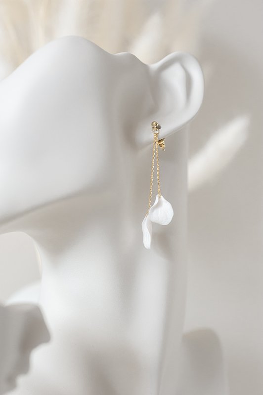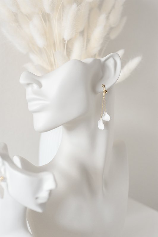 Die Ohrringe sind feine handwerkliche Kunstwerke, die Natur und Eleganz auf einzigartige Weise verbinden. Jedes einzelne Blatt wurde liebevoll in Handarbeit aus Kunststoff gefertigt und zeigt feine Details, die an zarte Blütenblätter erinnern. Diese dezenten Ohrringe passen perfekt zu cleanen Brautkleidern, floraler Spitze oder natürlichen Blätterspitzen-Designs und setzen romantische Akzente voller Leichtigkeit.